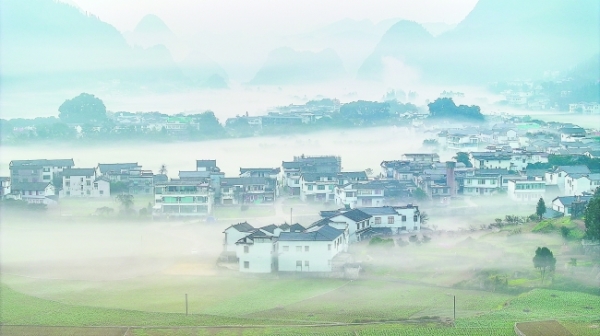 站在观景台上,你能看见湿润的雾气从地面升起,弥漫在田园上空,锥状山峰在雾气中若隐若现。将军峰至八卦田的山脊步道是观赏平流雾的最佳位置。当晨光穿过薄雾,洒在青瓦白墙的布依民居上,构成了一幅动人的水墨长卷。