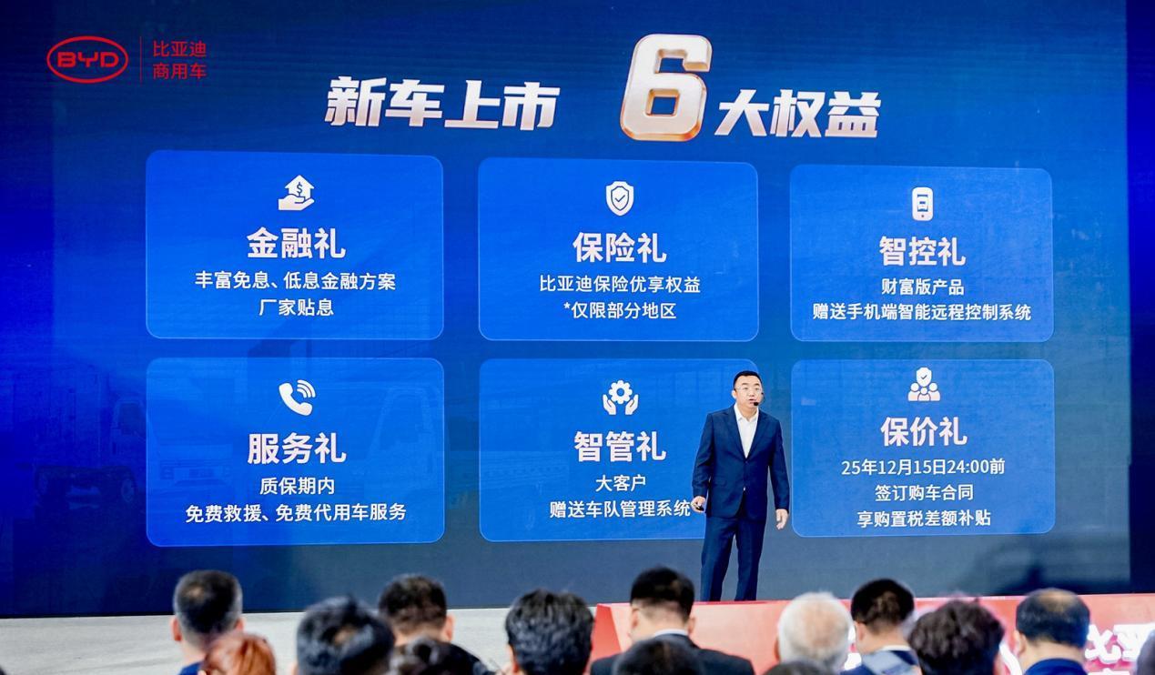 比亚迪同步推出6大权益,包括金融免息、保险优惠、远程控制系统赠送等,覆盖购车与用车全周期,三电系统享受10年/80万公里质保,助力用户高效创富,推动城配物流绿色升级。