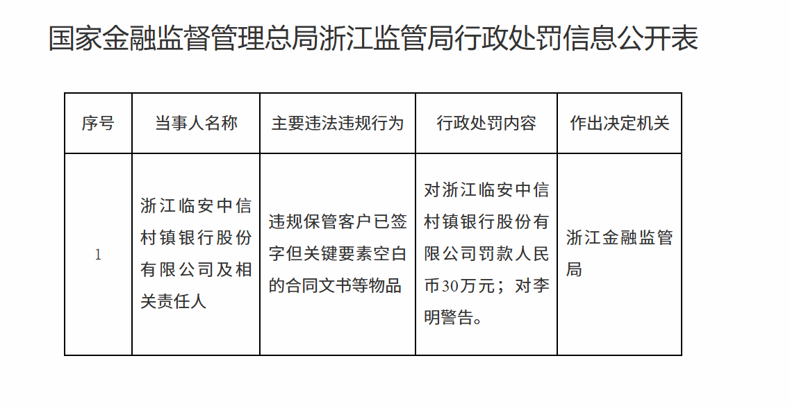 12月4日郑州配资网,国家金融监督管理总局浙江监管局行政处罚信息公开表显示,浙江临安中信村镇银行股份有限公司及相关责任人因违规保管客户已签字但关键要素空白的合同文书等物品被罚款人民币30万元;李某被警告。