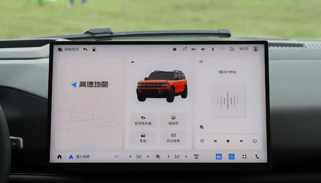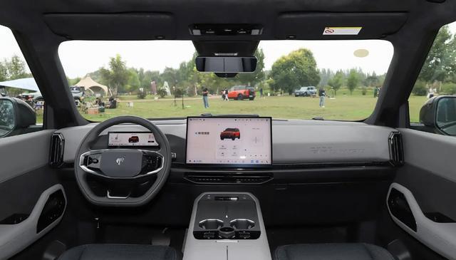 进入到驾驶舱,车辆也采用了一个较为简洁的座舱风格,但又通过多区域的把手、多边形结构同时强调了方盒子的硬派表达,应该说融合度上把握得不错。在装饰上,智趣烈马会有面积不小的翻毛材质,触感上是比较高级的’而结构上,多区域的横向立体层次、贯穿式的扶手箱与储物,还有对应着的按键与大旋钮,这操作便捷性也照顾到了。