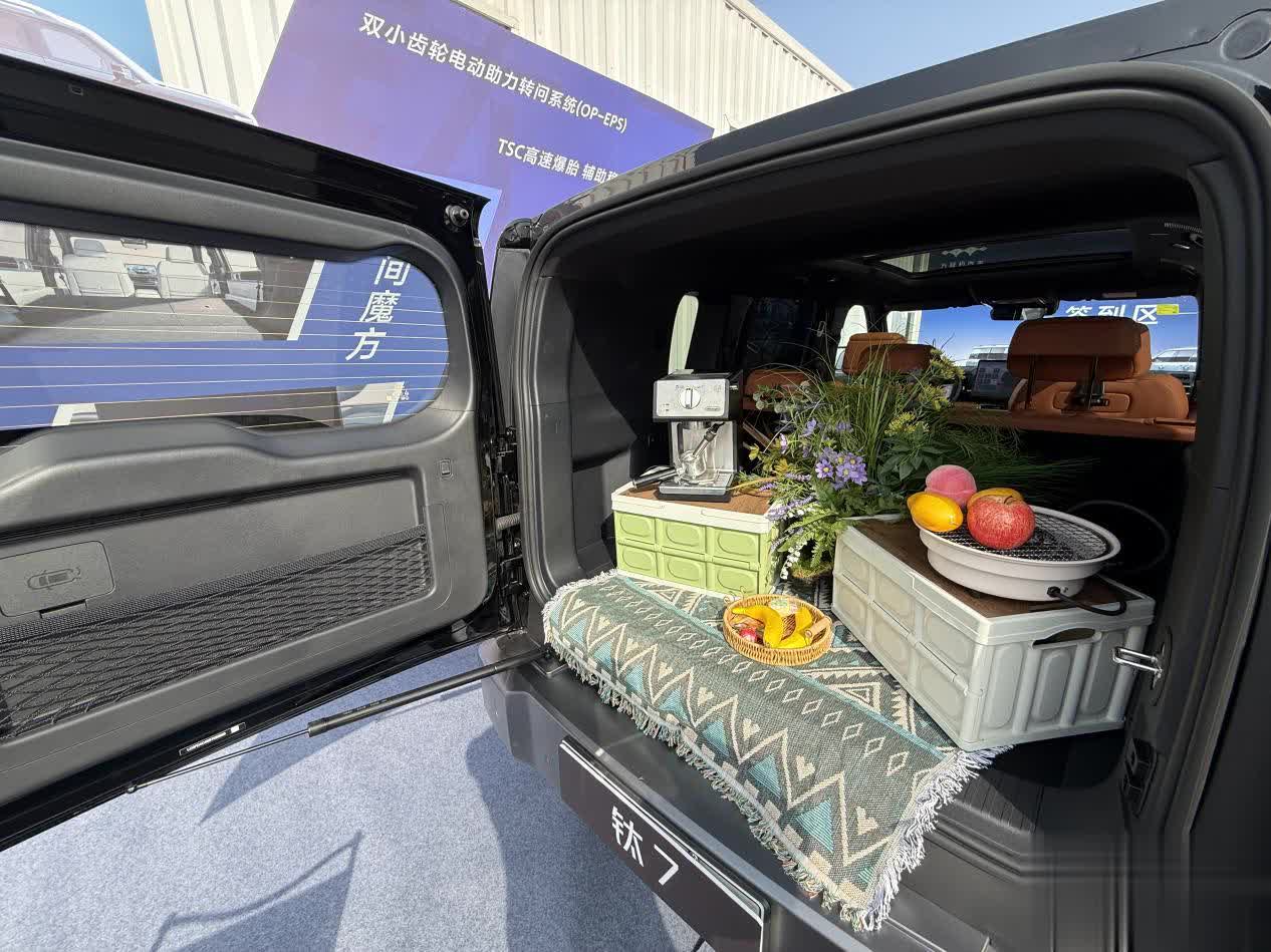 再一个,钛7的车内储物空间也有很多,除了常见的门板、手套箱、中控台下方镂空之外,这车还自带一个小冰箱……换句话说,就是你尽管带东西,剩下的交给钛7就行。